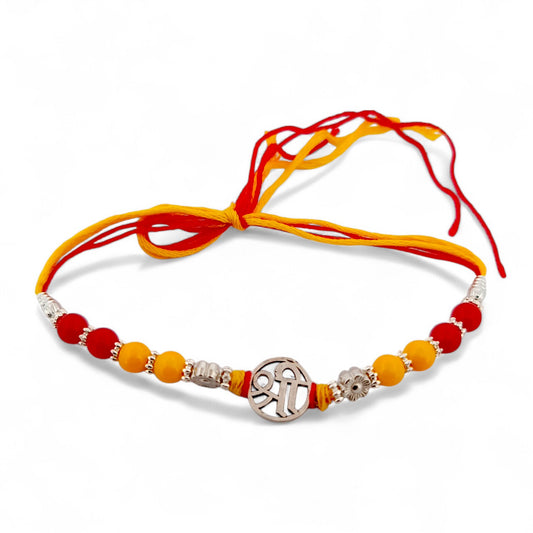Honor the sacred bond of Raksha Bandhan with this beautifully handcrafted Sterling Silver Oxidized Shree Rakhi. Featuring the revered "Shree" symbol—an embodiment of wealth, purity, and divine blessings—this rakhi is designed to bring prosperity and protection to your brother’s life. Expertly crafted in hallmarked 925 sterling silver, the centerpiece is accented with detailed floral motifs and complemented by vibrant threads and colorful beads, making it both meaningful and stylish. The high-quality materials ensure long-lasting shine and sentimental value, making it more than just a rakhi—it’s a cherished keepsake.
