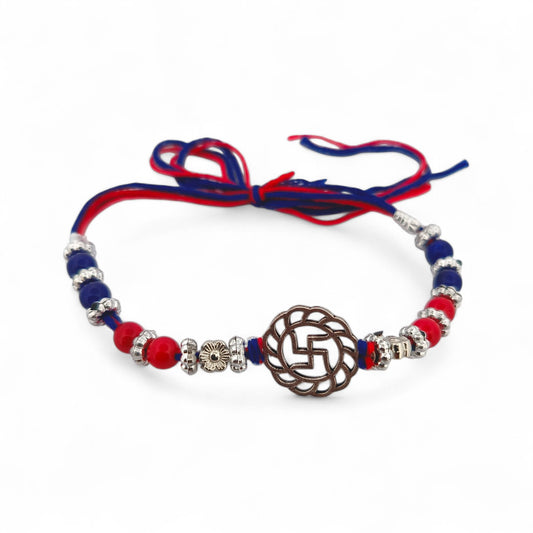 Celebrate the eternal bond of love and protection with this beautifully crafted Sterling Silver Oxidized Swastik Rakhi. Featuring the revered Swastik symbol—an ancient sign of prosperity, purity, and good fortune—this rakhi radiates spiritual energy and cultural richness. Made from hallmarked 925 sterling silver, the centerpiece showcases intricate detailing and is paired with vibrant red and blue threads, adorned with traditional beads and silver accents. The Swastik symbol not only blesses your brother with positivity but also serves as a lasting reminder of your love and prayers.