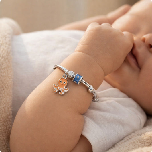 Add a fun and playful touch to your child’s jewellery collection with this Sterling Silver Kids Adjustable Octopus Charm Bangle, crafted from premium 925 sterling silver. Designed with a cute octopus charm and stylish bead detailing, this bangle brings a unique and cheerful look while ensuring comfort with its adjustable fit for babies and toddlers.