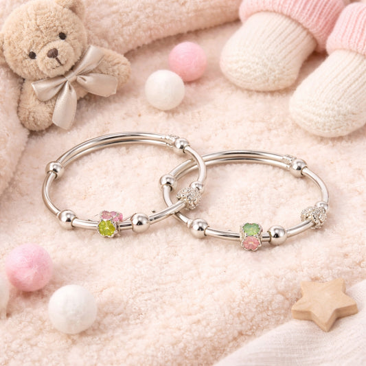 This kids silver floral charm bangle is lightweight, skin-friendly, and durable, making it perfect for delicate baby skin. A graceful and meaningful choice, it makes an ideal gift for newborn baby, baby shower, naming ceremony, birthdays, and festive occasions for both baby boys and girls.