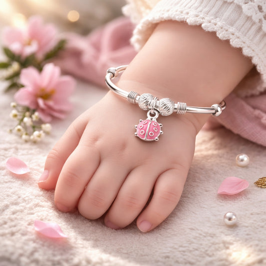 This kids silver charm bangle is lightweight, skin-friendly, and durable, making it ideal for delicate baby skin. A perfect blend of style and meaning, it is an excellent gift for newborn baby, baby shower, naming ceremony, birthdays, and festive occasions for both baby boys and girls.