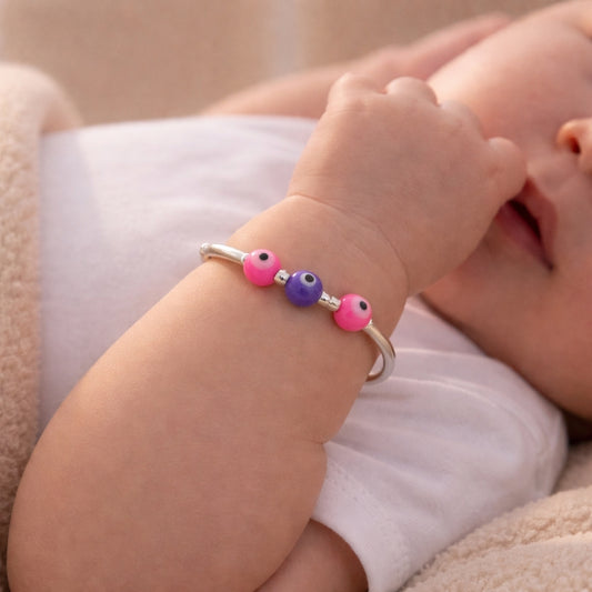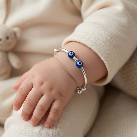 Protect and style your little one with this Sterling Silver Kids Adjustable Dual Evil Eye Nazariya Bangle, crafted from premium 925 sterling silver. Designed with dual evil eye beads, it is believed to offer protection from negative energy while adding a modern, elegant touch. The adjustable design ensures a comfortable fit for babies and toddlers, making it perfect for everyday wear.