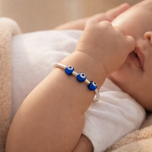 This kids silver nazariya bangle is lightweight, skin-friendly, and durable, ideal for delicate baby skin. A meaningful and stylish choice, it makes a perfect gift for newborn baby, baby shower, naming ceremony, birthdays, and festive occasions for both baby boys and girls.