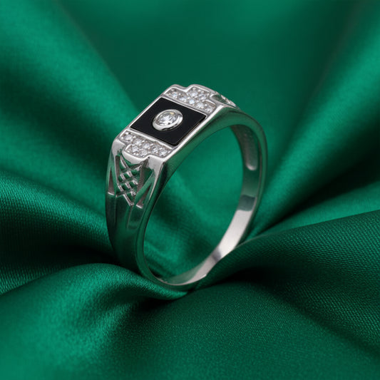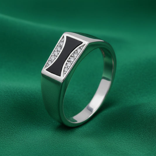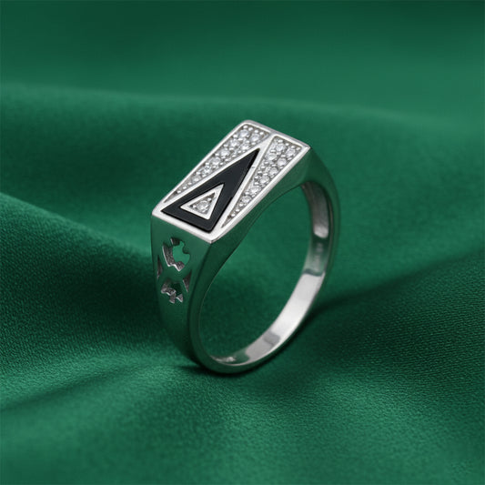 The EterKnight Noir Apex ring is crafted in 92.5 sterling silver, featuring a striking black enamel apex motif framed by refined stone detailing. Its sharp geometry and structured form reflect strength, confidence, and modern masculinity. Designed for long-lasting shine, it offers comfort for daily wear while standing out effortlessly at parties and special occasions.