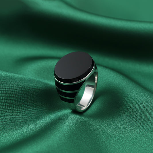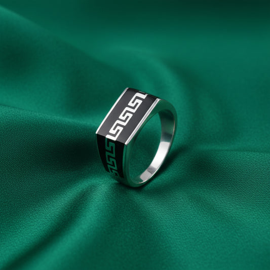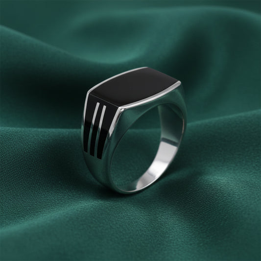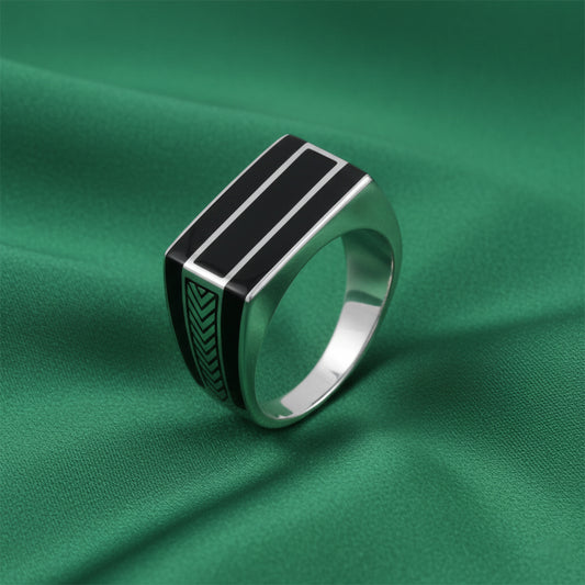 The EterKnight Noir Stride ring is crafted in 92.5 sterling silver, featuring a sleek black enamel face accented with sharp linear detailing that adds a sense of movement and strength. Its smooth, solid build offers long-lasting shine and comfortable wear, making it ideal for everyday styling as well as evening or party occasions.