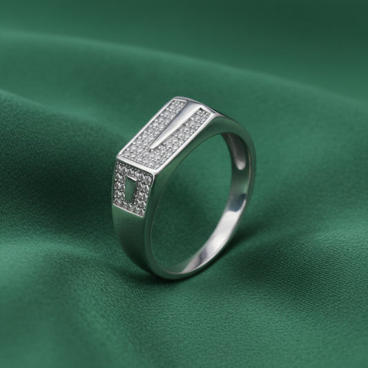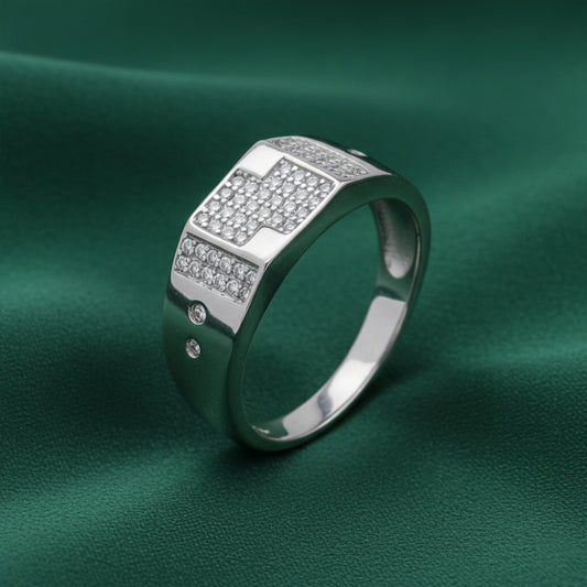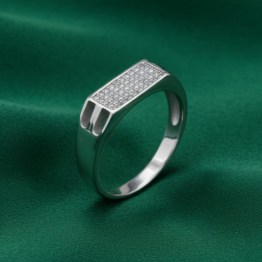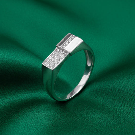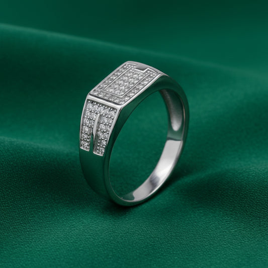 The EterKnight Vector ring is crafted in 92.5 sterling silver, featuring a sleek, angular design highlighted with finely set stones that add subtle brilliance. Its clean geometry and polished finish create a refined look with long-lasting shine and comfortable everyday wear.