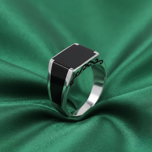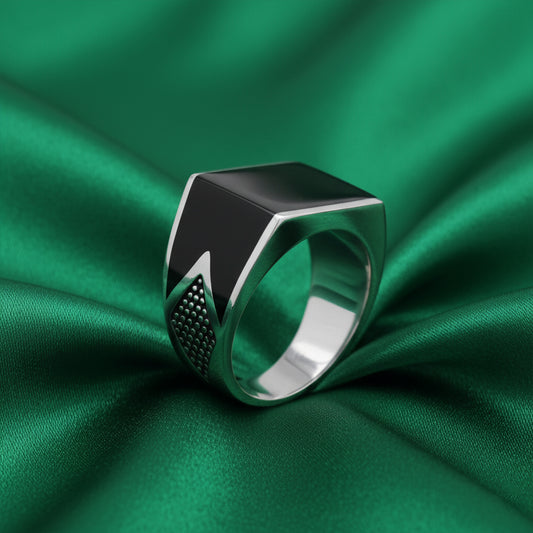 The EterKnight Noir Sovereign ring is crafted in 92.5 sterling silver, featuring a deep black enamel face with sharp, architectural edges. The polished silver shank is accented with subtle ornamental detailing along the side, adding character without excess.
