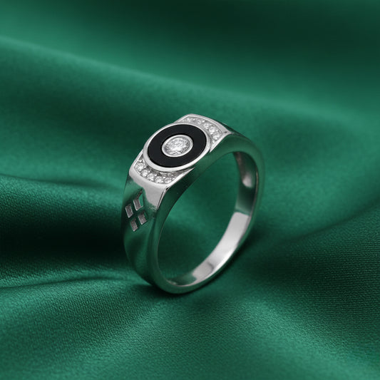 The EterKnight Orbit Core ring is crafted in 92.5 sterling silver, featuring a striking circular black enamel accent with a brilliant stone-set core. The balanced design adds depth and character, while the smooth, polished finish ensures long-lasting shine and comfort for daily wear.