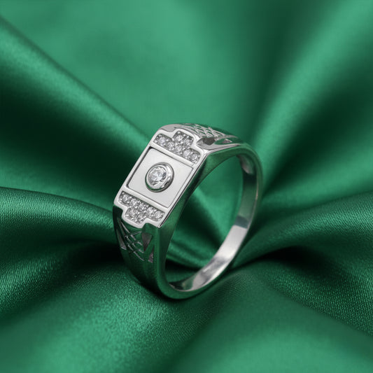The EterKnight Centric Core ring is crafted in 92.5 sterling silver, defined by a polished central panel set with a single brilliant stone, framed by subtle pavé accents. The structured silhouette and engraved side detailing add depth without overpowering the design.