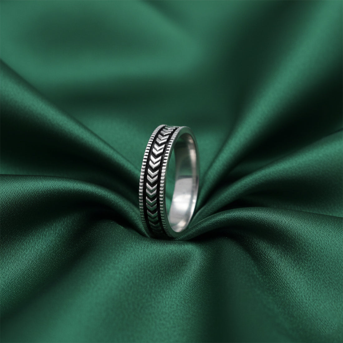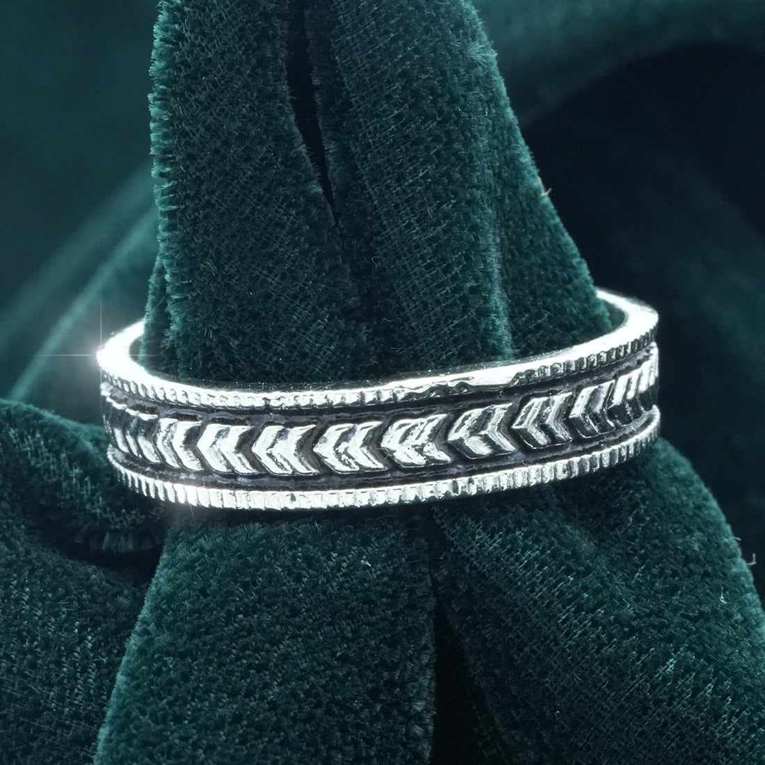 925 Sterling Silver defines the strength of the EterKnight Arrow Spine Oxidised Ring, featuring a sharp arrow-inspired spine pattern that symbolises direction, focus, and forward momentum. The oxidised detailing enhances the depth of the engraved design, creating a bold contrast that gives this band a powerful, masculine presence.