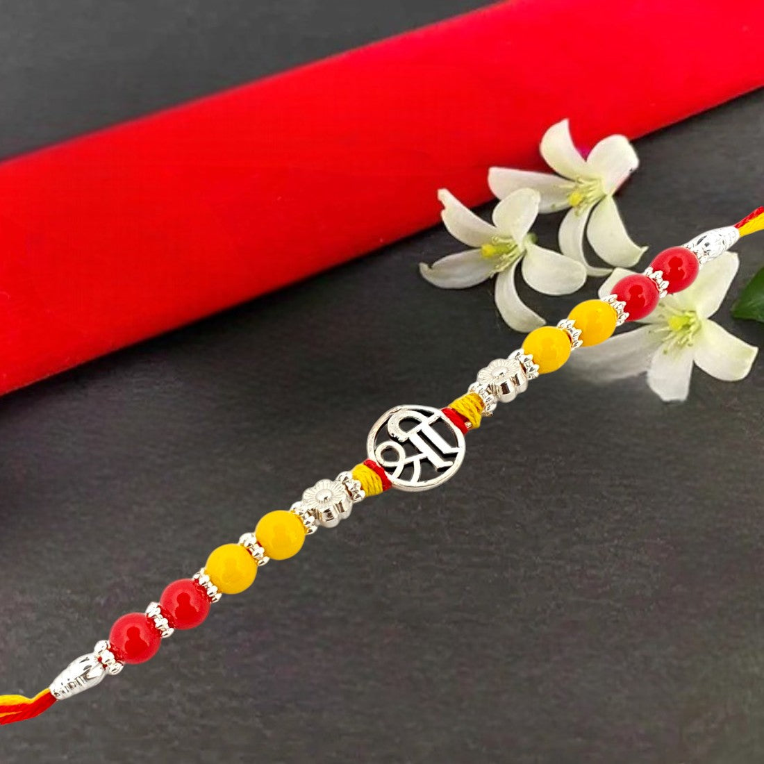 Honor the sacred bond of Raksha Bandhan with this beautifully handcrafted Sterling Silver Oxidized Shree Rakhi. Featuring the revered "Shree" symbol—an embodiment of wealth, purity, and divine blessings—this rakhi is designed to bring prosperity and protection to your brother’s life. Expertly crafted in hallmarked 925 sterling silver, the centerpiece is accented with detailed floral motifs and complemented by vibrant threads and colorful beads, making it both meaningful and stylish. The high-quality materials ensure long-lasting shine and sentimental value, making it more than just a rakhi—it’s a cherished keepsake.